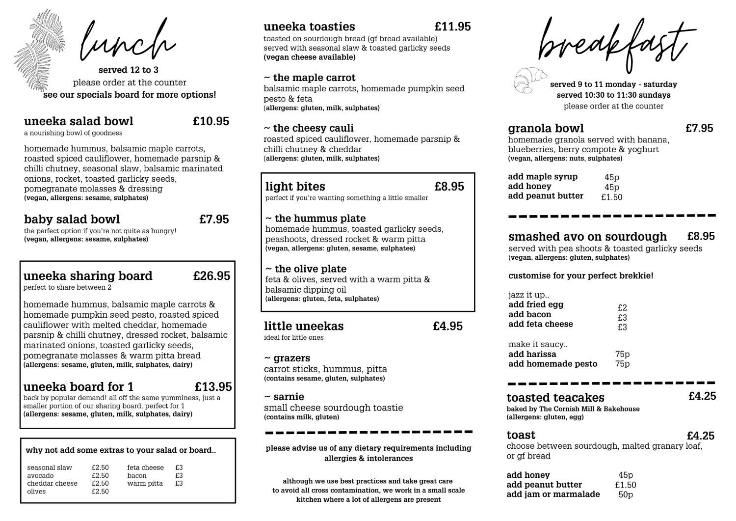 Nutritious breakfasts served 9.00 until 11:15 am - Seasonal lunches served 12:00 until 3:00 pm