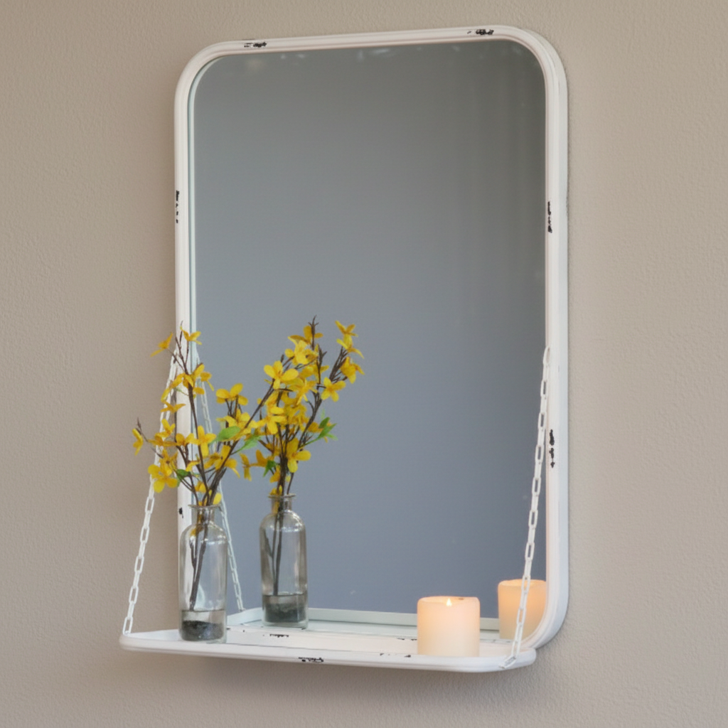 A small hanging shelf, suspended from two delicate chains, adds both practicality and unique style - perfect for displaying small décor pieces, candles or everyday essentials. Combining hints of industrial design with antique elegance, this mirror is ideal for hallways, dressing areas or bedrooms where both function and personality matter.