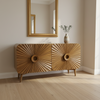 Add warmth and artistry to your home with the Carved Sunburst Four Door Sideboard. Expertly crafted from solid mango wood, this striking piece features intricate hand-carved sunburst designs across its four doors, creating a captivating play of texture and light.