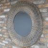 Enhance your space with our Circular Mirror with Oriental Brass Detailing. Crafted from durable metal, its large, round frame features intricate, oriental-inspired patterns finished in a warm brassy gold, adding elegance and character to any room.