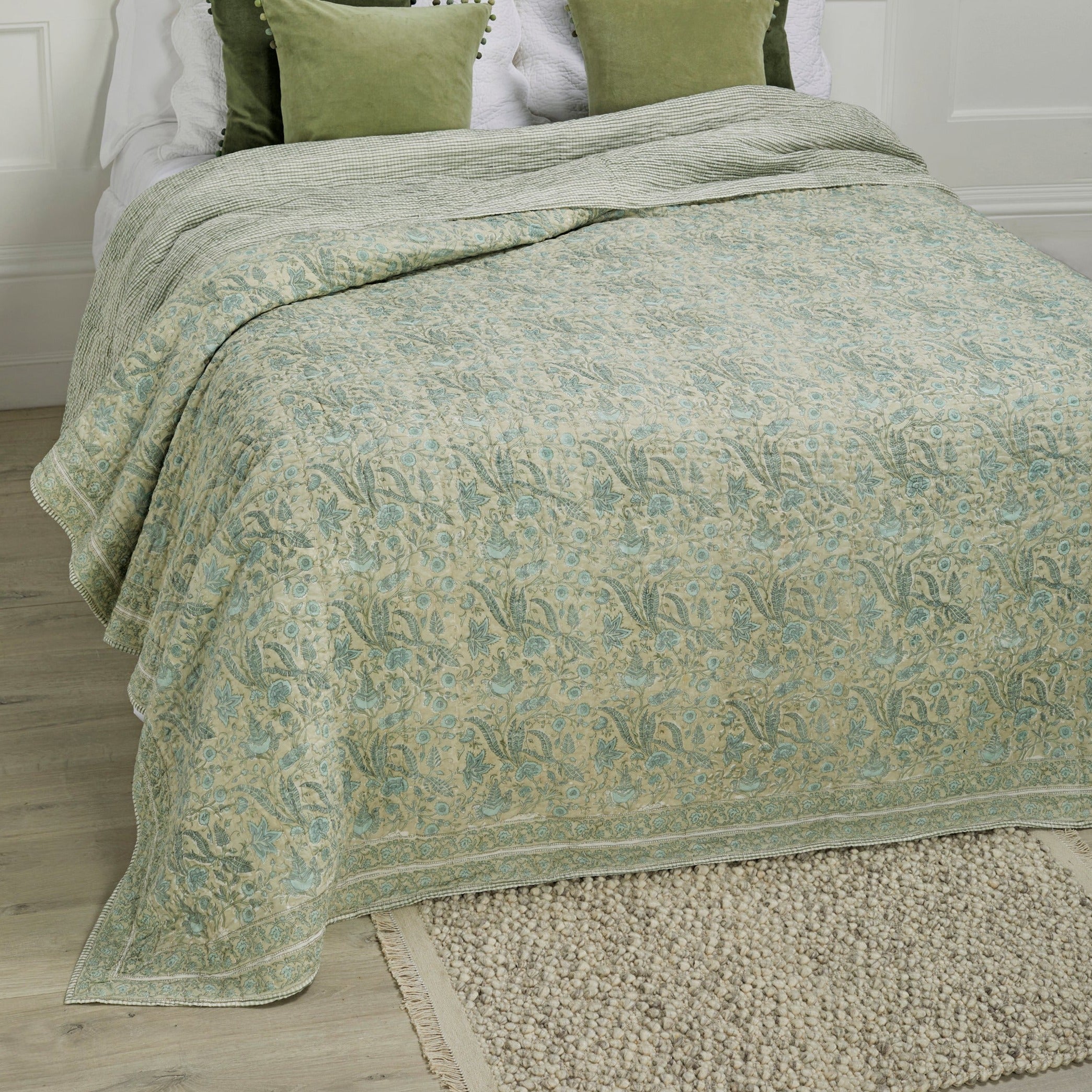 The Jaipur Olive Hand Block Printed Bedcover is crafted by skilled artisans and features traditional kantha stitching for added texture and character. Each piece is block printed by hand, giving it a distinctive, one-of-a-kind finish. The soft sand tone and quilted design bring subtle elegance and comfort.