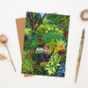 Immerse yourself in botanical beauty with our Illustrated Shaded Tropical Garden Greetings Card. From an original mixed media painting by a local artist, this card captures the lush serenity of a shaded garden filled with layered tropical foliage. Painted in gouache and enriched with colour pencil and pastel details, it brings nature’s depth and tranquillity to life. Blank inside for your own message, it’s ideal for birthdays, thank yous, or heartfelt everyday notes.