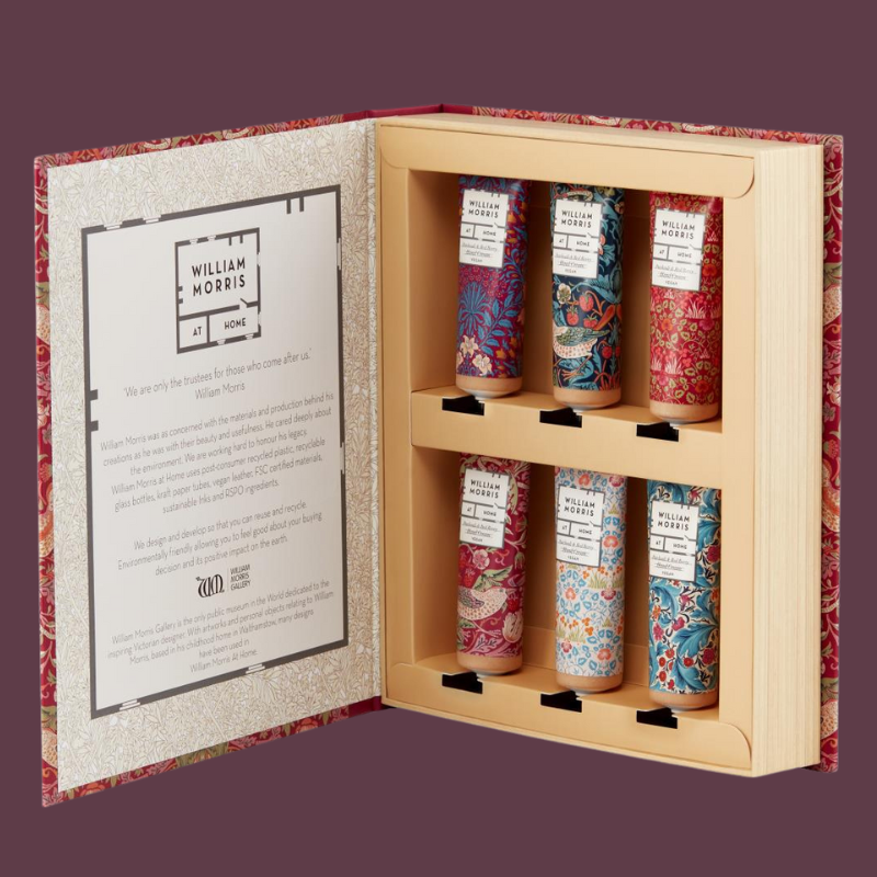 Treat someone special (or yourself) to a beautifully presented collection of six Patchouli & Red Berry hand creams, inspired by the iconic Strawberry Thief heritage print. Housed in a reusable book-style box, this charming gift set brings together velvety, vegan-friendly formulas enriched with shea butter, cocoa butter, jojoba oil, macadamia oil, and vitamin E to help keep hands soft, nourished, and cared for.